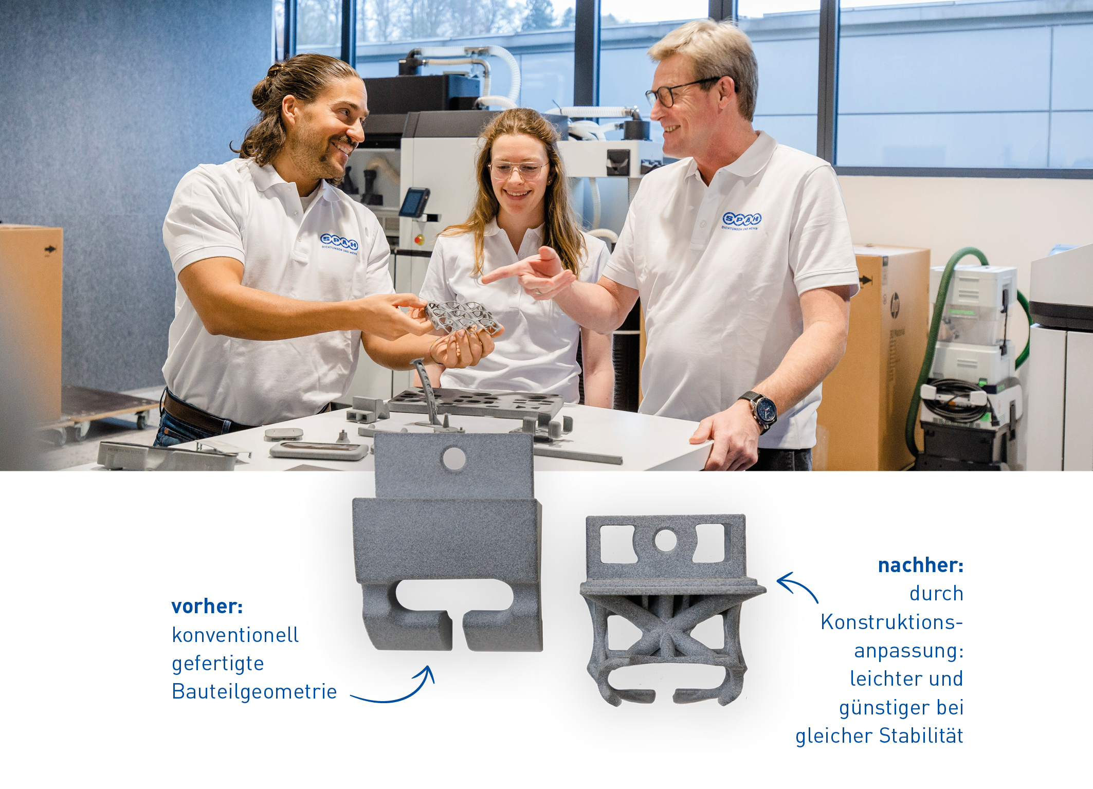 Ein zusätzlicher Mehrwert dieser Verfahrenstechnik wird über die Konstruktionsanpassung geschaffen. SPÄH hat bei seinen Kundenprojekten durch Konstruktionsoptimierung und Werkstoffwechsel Material bis zu 50 % eingespart sowie bis zu 60 % Gewicht des Bauteils reduziert - bei verbesserter Funktionalität und gleicher Stabilität. Durch diese Anpassung wurden die Bauteile im Schnitt 30-50 % kosteneffizienter.